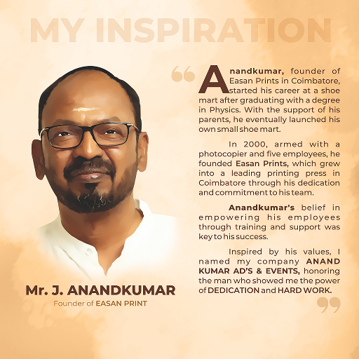 Anandkumar, founder of Easan Prints in Coimbatore, started his career at a shoe mart after graduating with a degree in Physics. With the support of his parents, he eventually launched his own small shoe mart. In 2000, armed with a photocopier and five employees, he founded Easan Prints, which grew into a leading printing press in Coimbatore through his dedication and commitment to his team. Anandkumar belief in empowering his employees through training and support was key to his success. Inspired by his values, I named my company ANAND KUMAR AD’S & EVENTS, honoring the man who showed me the power of DEDICATION and HARD WORK.